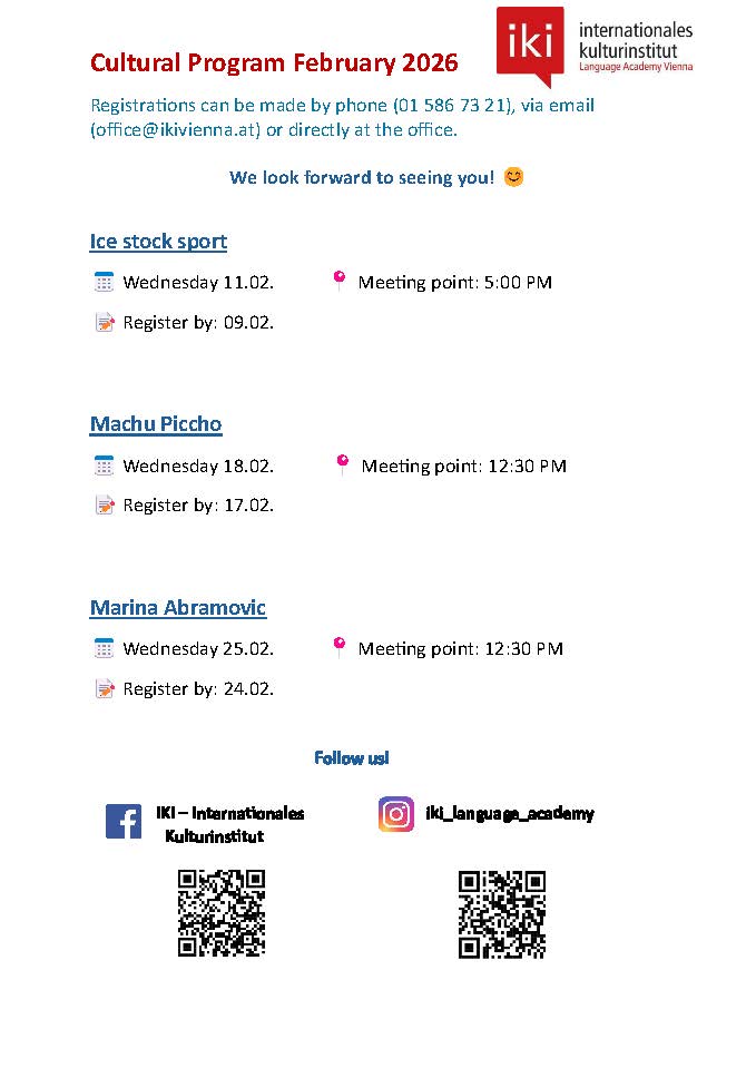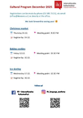 During the summer months of July and August, we offer free after-class activities several times a week. These include excursions, museum visits, movie nights, cooking sessions, and our popular IKI parties. These activities not only allow you to discover Vienna and Austrian culture but also to connect with fellow course participants.
